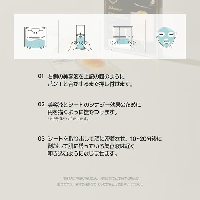 - πDNew Application Concept: Elevate your masking ritual with our new concept design. Follow three simple steps for optimal results: (1) Fold the pouch as shown in the picture. (2) Rub in a circular motion to ensure the sheet is soaked in the essence. (3) Apply the sheet