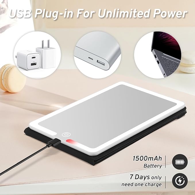 - 【Rechargeable Illuminated Mirror】Built-in 1500mAh lithium battery, connect a laptop, charger or mobile power supply via Type-C cable for charging, no need to change battery. Travel vanity mirror comes with a 20" USB cable, a fully charged last about 7 days, making it the perfect travel companion.