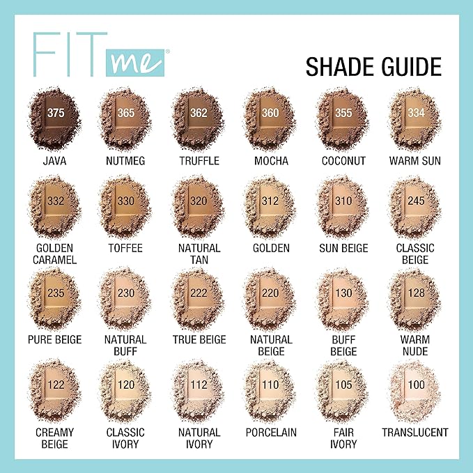 - A Shade That Fits Me: Maybelline Fit Me finishing powder provides coverage for a wide array of skin tones, from Ivory to Mocha; Use as a setting powder or to control shine for a flawless, natural-looking, "I woke up like this" finish