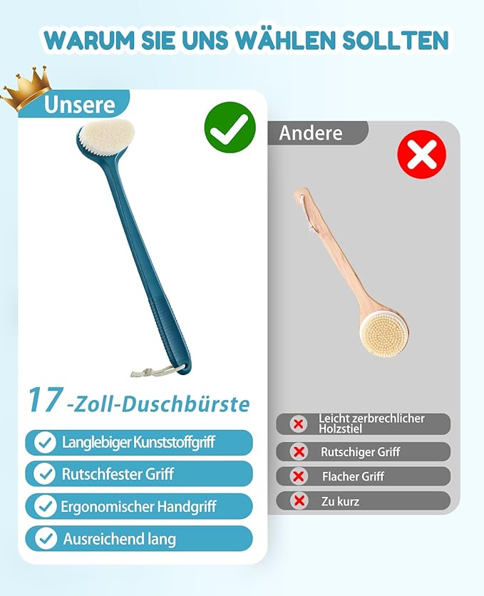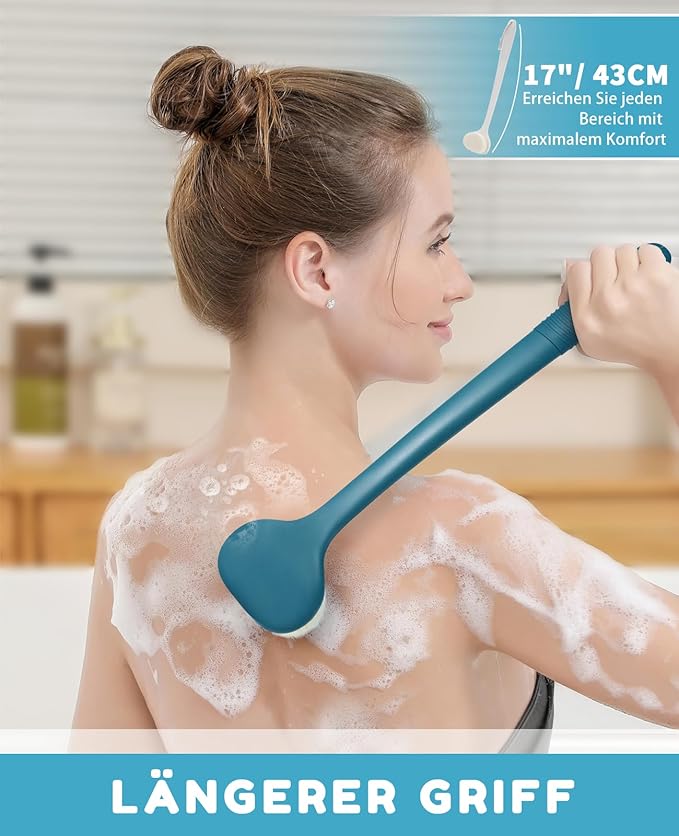 - Non-Slip Grip & Ergonomic Long Handle: Have you ever struggled with a slippery shower brush that keeps slipping from your hand, especially when wet? Unlike other back brushes without a silicone grip, our non-slip silicone handle ensures enhanced control, minimizing slippage and providing a secure, comfortable shower experience. The 17-inch ergonomic curved handle extends your reach, making it effortless to clean even the hardest-to-reach areas without straining.