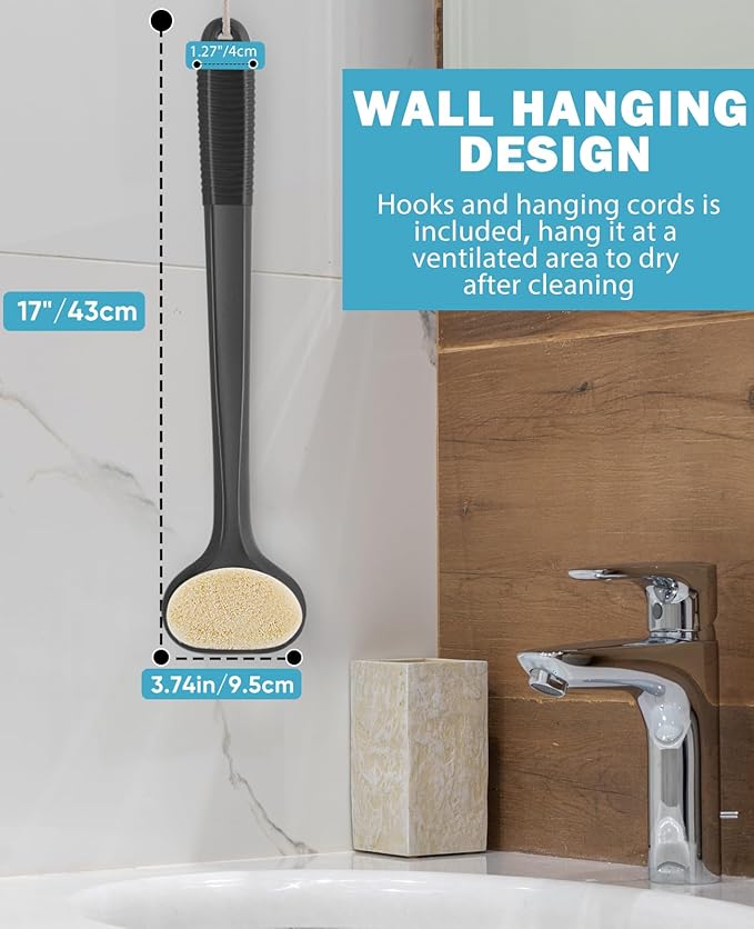 - Non-Slip Grip & Ergonomic Long Handle: Have you ever struggled with a slippery shower brush that keeps slipping from your hand, especially when wet? Unlike other back brushes without a silicone grip, our non-slip silicone handle ensures enhanced control, minimizing slippage and providing a secure, comfortable shower experience. The 17-inch ergonomic curved handle extends your reach, making it effortless to clean even the hardest-to-reach areas without straining.
