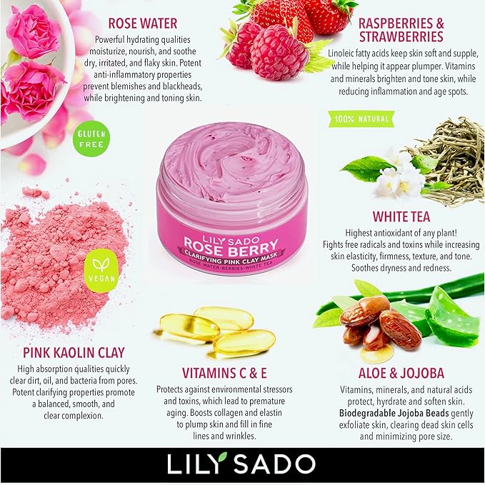 - πΈ Soothing & Purifying Rose Water, Berries & White Tea β make this creamy, clarifying Face Mask the solution for balanced, bouncy skin. Pure White Tea and Pink Kaolin Clay quickly clear away excess oil, grime and blackheads. Rose Water, Aloe & Jojoba hydrate and soften dry, dull skin. Nutrient-rich Raspberry and Strawberry Extracts nourish and guard against free radicals and daily stressors, while controlling puffiness.