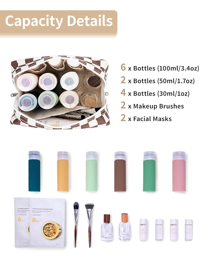 - WELL-ORGANIZED COMPARTMENTS. Practical main compartment with 5 inner small pockets could neatly organize your makeup. Main compartment could easily hold travel-size toiletries or skin-care products. It could fit 3 brushes, eyeliners, foundation, concealer, lipsticks, blushes, powder, eyeshadow pallet, mascara, lash curler, sponges, sunscreen, 3oz lotion, cream, facial cleanser and toothpaste
