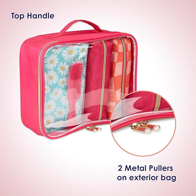 - LARGE MAIN CASE: The smaller bags fit inside the large 10.5” x 4” x 8.5” clear PVC bag with pink polyester trim for at-home storage or on-the-go organization.