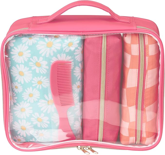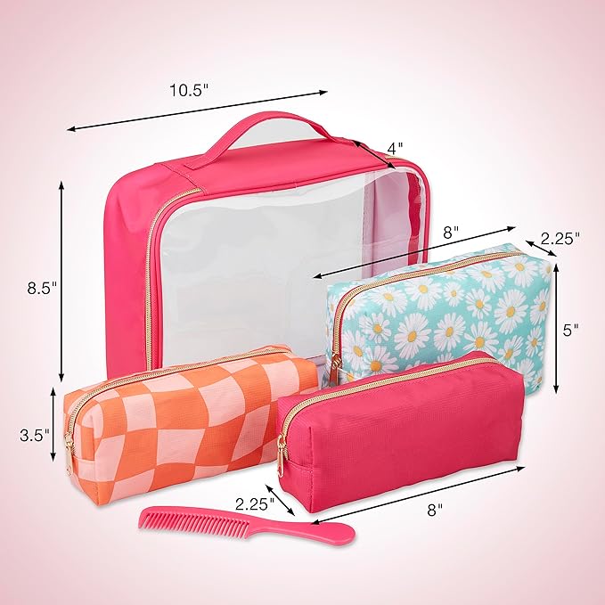 - 5-PIECE TOILETRY TRAVEL SET: Includes 2 polyester pencil cases (1 in orange and pink checkered print, 1 in solid pink), 1 large polyester organizer with floral daisy print, 1 large pink comb, 1 large clear and pink bag.