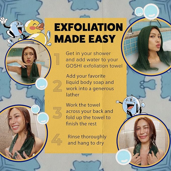 - Exfoliation Made Easy: Get ready to feel the softest and cleanest youβve ever been. The GOSHI exfoliating towel is a game-changing Japanese shower towel and body scrubber exfoliator with more substantial surface area coverage, allowing you to clean hard-to-reach areas without the cumbersome parts that can ruin your entire shower experience. The perfect replacement for your loofah, glove, scrub brush, and even your old towel brand.