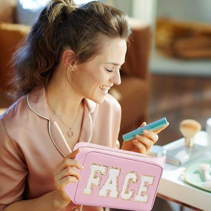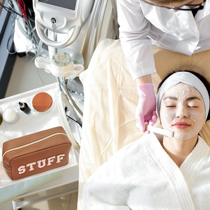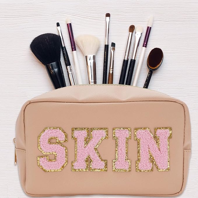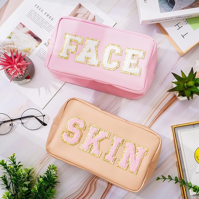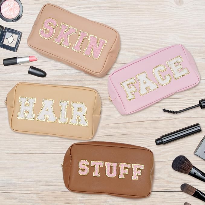 Whaline 4 Pcs Preppy Makeup Bag Chenille Letter Cosmetic Bag PU Leather Waterproof Toiletry Bag Portable Makeup Pouch Organizer Zipper Patches for Women Gifts(Earth Tone,Skin,Stuff,Hair,Face)