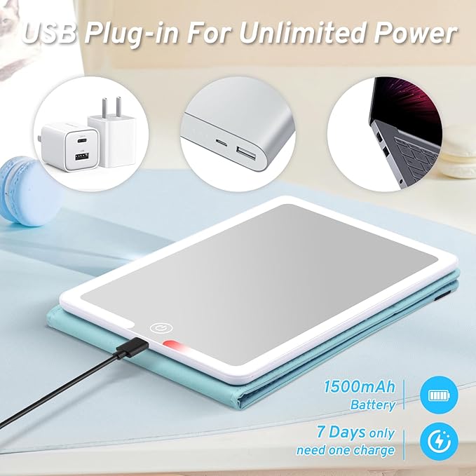 - 【Rechargeable Light Up Mirror】Built-in 1500mAh lithium battery, connect a laptop, charger or mobile power supply via Type-C cable for charging, no need to charge frequently or change battery any more. Makeup mirror with lights comes with a 20" USB cable, a fully charged last about 7 days, making it the perfect travel companion.