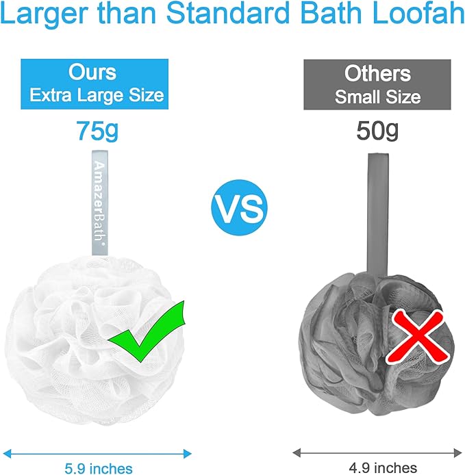 • Nice foaming effect: The AmazerBath loofah sponge has a dense, fluffy mesh that allows you to create a rich and luxurious lather with just a small amount of body wash or soap. (Using AmazerBath loofa can save you 20% of the shower gel)
