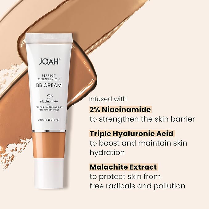 JOAH Beauty Perfect Complexion BB Cream with Hyaluronic Acid and Niaciminade,Korean Makeup with Medium Buildable Coverage,Evens Skin Tone,Lightweight,Semi Matte Finish,Tan with Neutral Undertones