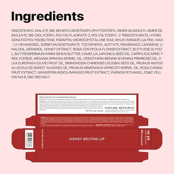 Nature Republic HONEY MELTING LIP (04 POMEGRANATE) SOFT LIP STICK, Hydrating Gloss, Moisturizing balms, Sheer tint, Shine & Glowy Finish, korean make up