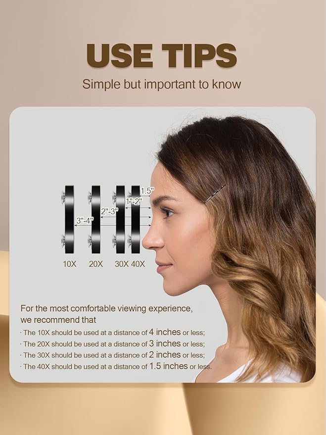 • Helpful tip : Due to the nature of the magnifying mirror, the distance between you and the mirror must be within 2 inches of the mirror, otherwise the image will appear distorted, blurred, reversed, etc