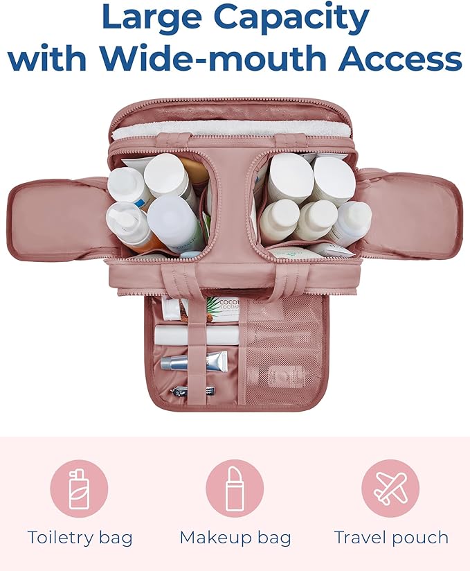 • Easy Access and Keep Upright : Full opening and not piling up for easy access to items. Double side full open design of travel bag keeps cosmetic bottles and toiletries can stand upright in the middle compartment. Avoid leakage during transit