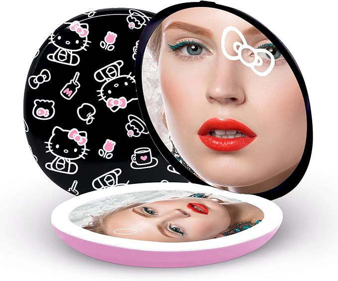 Impressions Vanity Hello Kitty The Favorites Compact Mirror with Light, Double Sided Cute Travel Makeup Mirror with Magnification, Soft Touch Button, and Adjustable Brightness