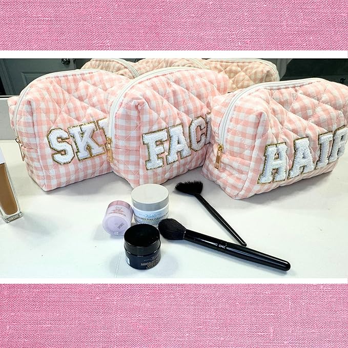 3pc Checker Makeup Cosmetic Bag Preppy Patch Travel Pouch for Women Chenille Letter Patch Small Portable Cosmetic Bag (Pink & White) (Bag Without Handle)