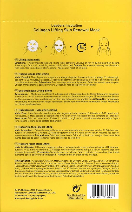 - LEADERS QUALITY ASSURANCE β Manufactured in South Korea by Leaders, a renowned skincare brand with its own R&D center and production facilities, each product undergoes rigorous testing to ensure the highest quality and effectiveness. Leaders Insolution Collagen Lifting Masks are easy to use: Cleanse and prep skin with toner. Remove mask from the pouch and fit to facial contours. Leave on for 10-20 minutes for optimal results. Gently massage extra serum into face and neck until fully absorbed.