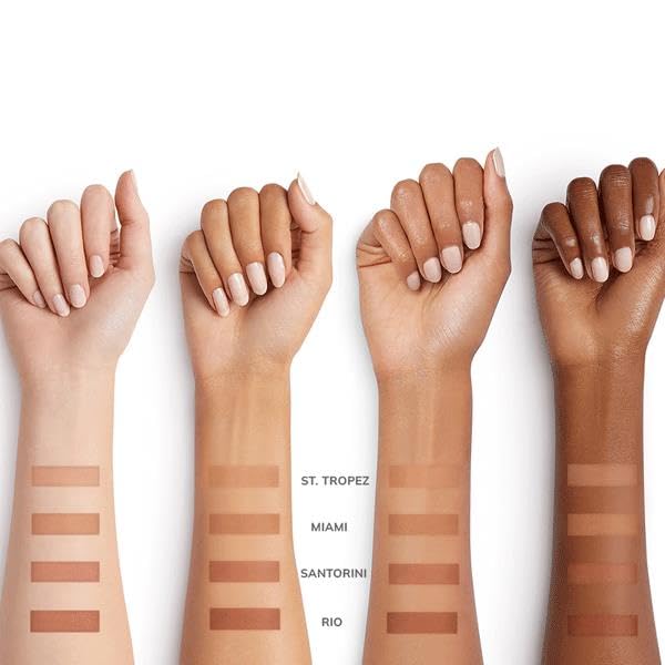 • St Tropez: Peachy Brown with warm undertone Miami: Diffused brown with warm undertone Rio: Dark brown with warm undertone Santorini: Medium brown with warm undertone