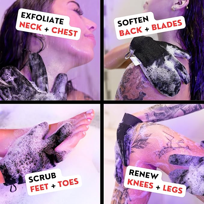 - π [2-PACK IN CLASSIC BLACK] Each set includes two exfoliating mitt gloves. Use one at a time or both for dual-action scrubbing. Designed to enhance any exfoliation technique and bring spa-level results to your home.
