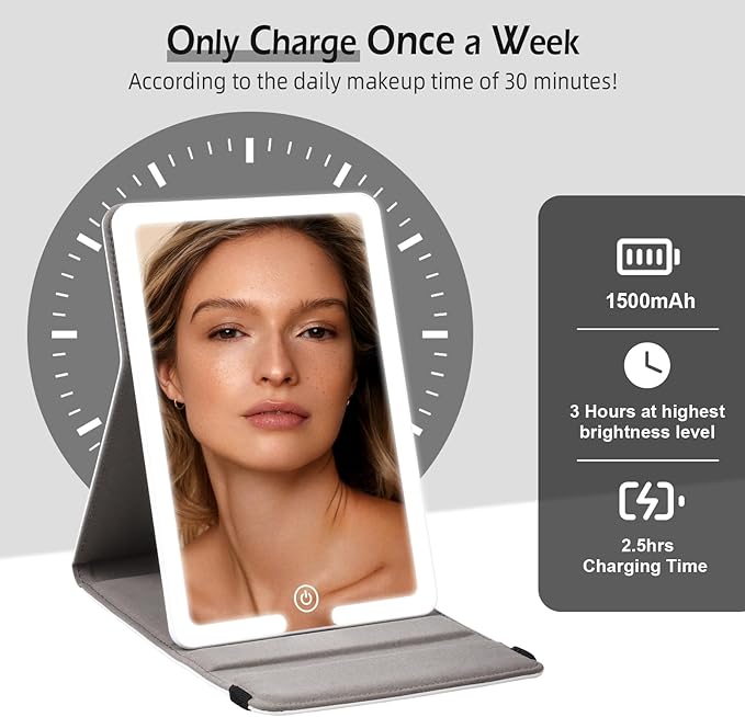 - 【Rechargeable Light Up Mirror】Built-in 1500mAh lithium battery, connect a laptop, charger or mobile power supply via Type-C cable for charging, no need to charge frequently or change battery any more. Makeup mirror with lights comes with a 20" USB cable, a fully charged last about 7 days, making it the perfect travel companion.