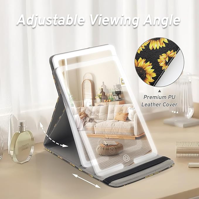 Makeup Mirror with Lights, PU Leather Travel Mirror with 3 Color Lighted Makeup Mirror with Sunflower Print, 8x5.5inch Vanity Mirror with Light Desktop Cosmetic Mirror, Lighted Travel Mirror for Women