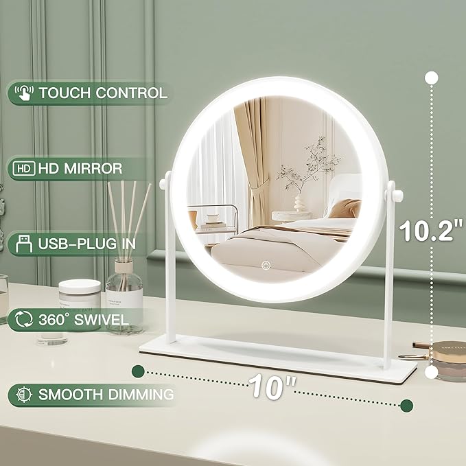 - 【Ideal Size & Stylish Design】 This makeup mirror measures 10" x 10"(Mirror Dimension), offering a perfect face view. Its circular shape ensures even light distribution by eliminating shadows and edges.