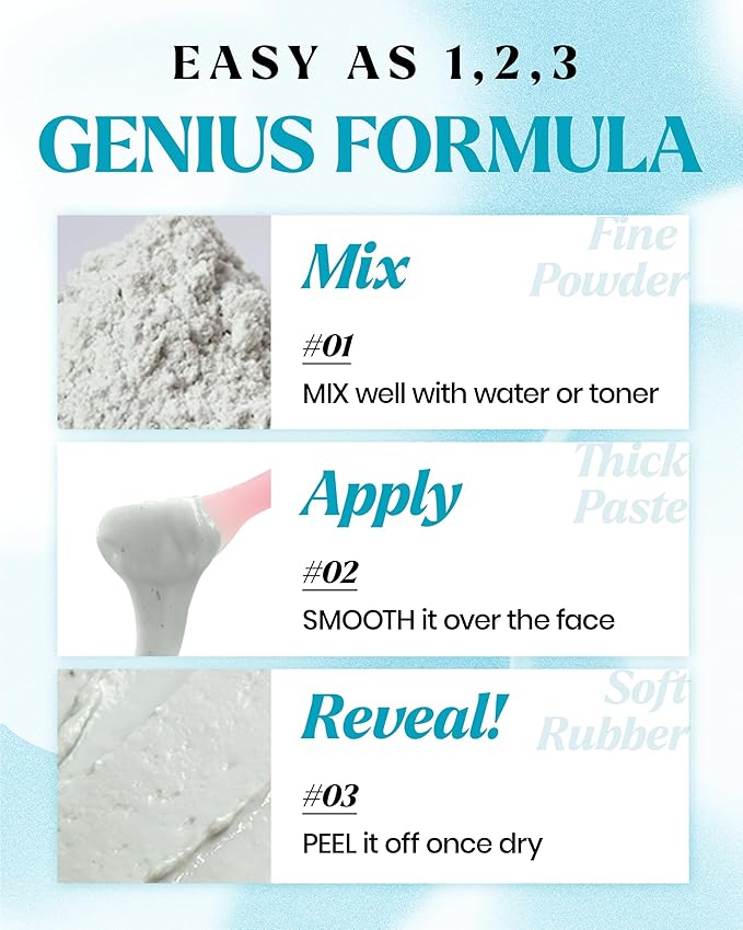 - EASY AS 1,2,3! Mix powder and water 1:1 in a mini bowl (1 spoon covers your face). Spread evenly with the spatula, applying a thicker edge for easy peeling. Leave on for 15β20 mins, peel off, and wipe residue with a cotton pad. Finish with moisturizer. 40 uses per 2.2 lb package!