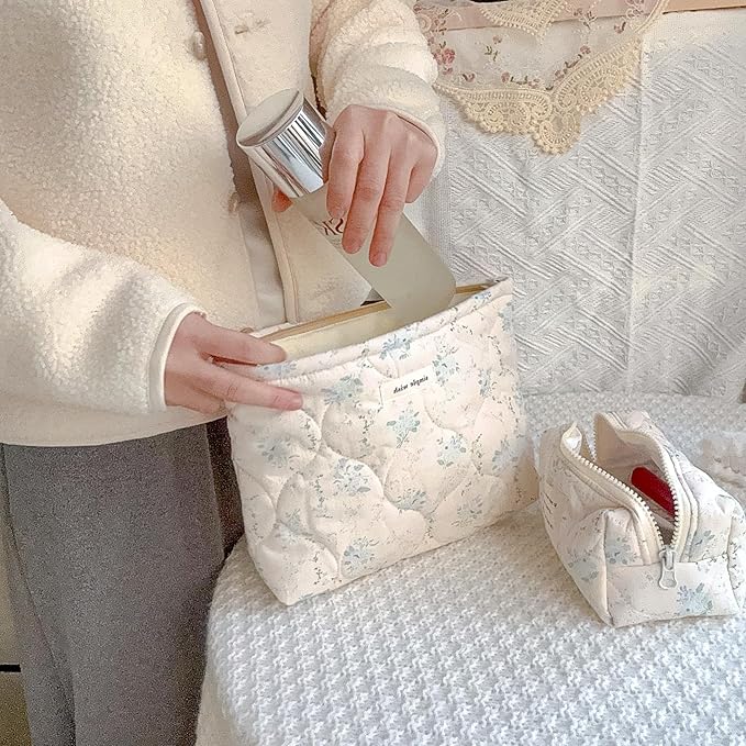 • Premium and Soft Cotton: Made from premium thick cotton material, this quilted makeup bag boasts a soft, durable texture that's gentle on your hands yet tough enough to endure daily use. easy to clean, lightweight. Unique aesthetics floral patterns, neat stitches and smooth zipper is not easily deformed, ensuring long-lasting use(Machine washable)