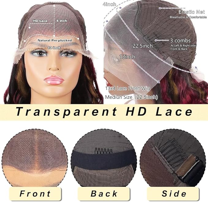 - 【13x4 Colored Body Wave Wig Cap】: Black red blonde wig cap Size Is Medium Size(22.5 Inches),3 Combs And Adjustable Straps,You Can Adjust The Hair Cap. It fit most people and easier to install and wear.