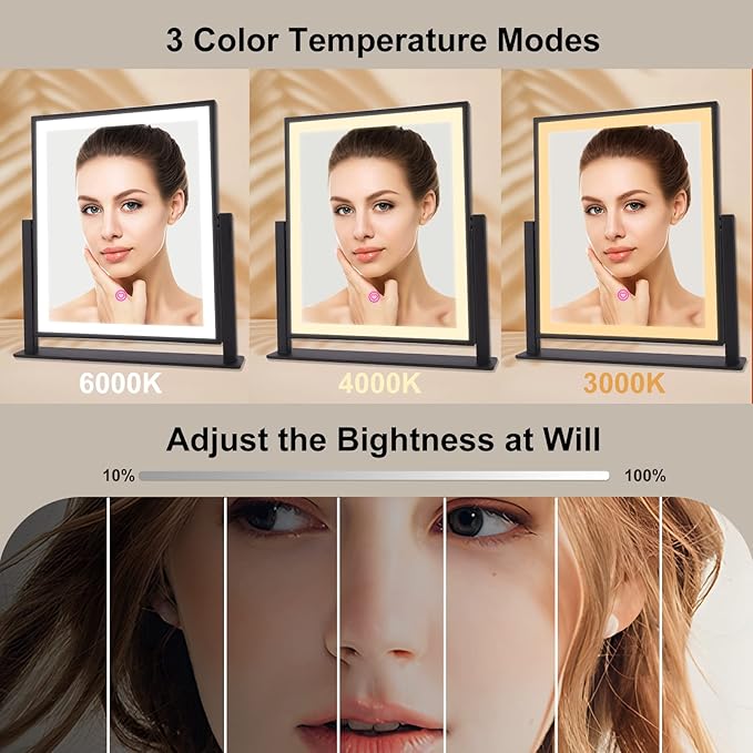 - Dimmable Touch Control:LED one-button touch to adjust 3 colors (3000K/4000K/6000K) ,Adjustbale brightness dimming (10%-100%) to make your makeup mirror lifelike. The smart memory always kept the best setting to help you show your beautiful self