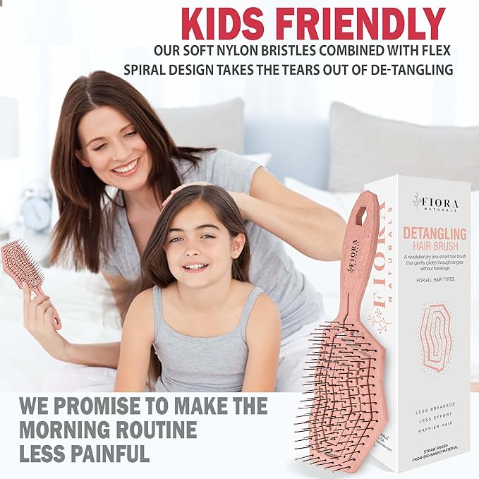 - KIDS FRIENDLY DETANGLER BRUSH- For parents with little girls and toddlers, we promise to make the morning routine less painful. Our soft nylon bristles combined with flex spiral design takes the tears out of de-tangling.