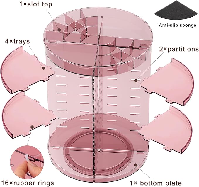 - 【360 Drgree Rotation】Jiavarry makeup storage organizer is designed to perfectly organize and store your cosmetics. The 360-degree rotatable function puts your items at your fingertips and saves you a lot of time before going out. Non-slip silicone on the bottom adds stability and features a sponge pad to hold the brush in place while rotating