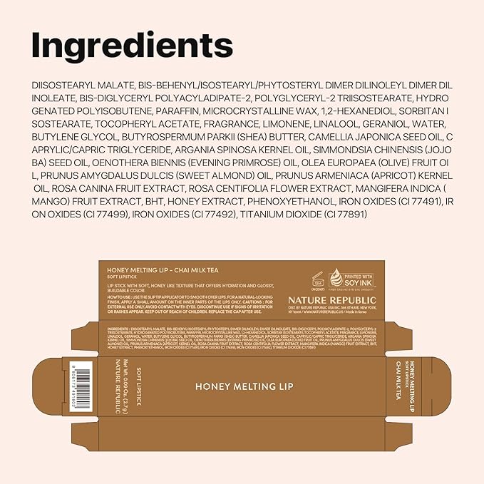 Nature Republic HONEY MELTING LIP (00 CHAI MILK TEA) SOFT LIP STICK Hydrating Gloss, Moisturizing balms, Sheer tint, Shine & Nude, Glowy Finish, korean make up