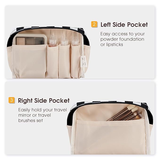 - Multiple Storage Compartments - Practical main compartment with 5 inner small pockets could neatly organize your makeup. Main compartment could hold many small items. Left side pockets could hold your concealer or lipsticks, while right side pocket are great for your travel mirror or travel brushes set. It could fit lipstick, blushes, powder, eyeliner, foundation, concealer, eyeshadow pallet, mascara, lash curler, sponage, small brushes