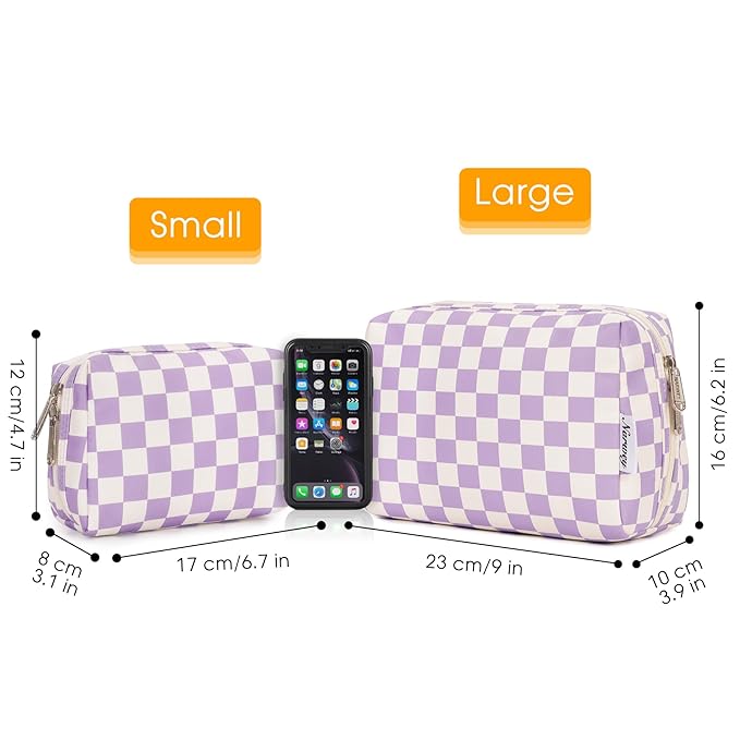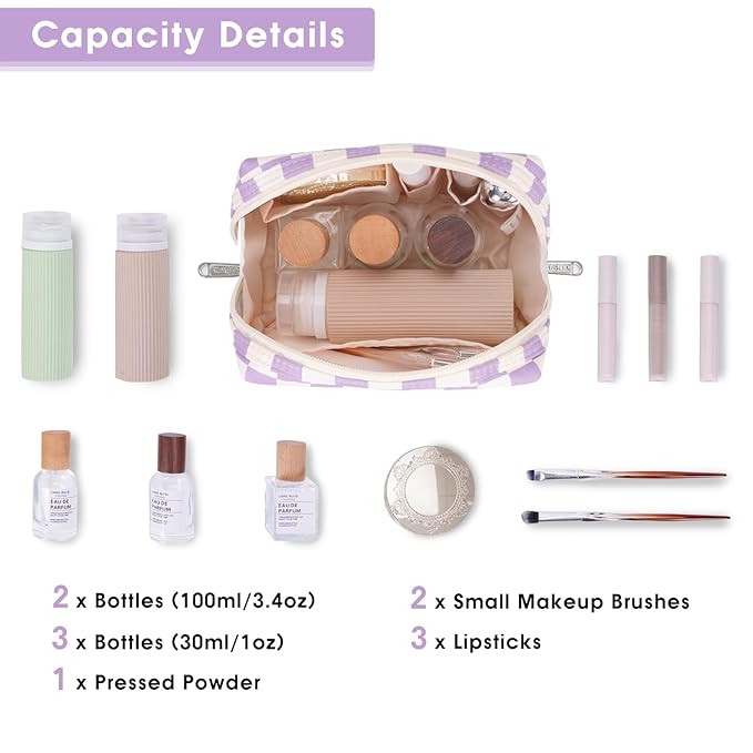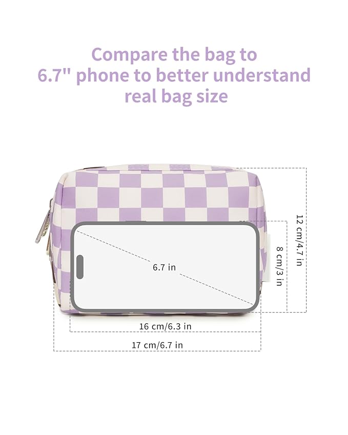 Narwey Small Checkered Makeup Bag for Purse Mini Cosmetic Bag Travel Makeup Pouch Zipper Pouch Cute Make up Bags with Compartments for Women Girls (Purple Checkerboard, Small)