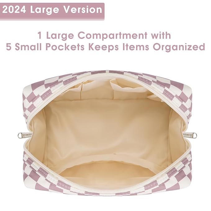 Narwey Checkered Makeup Bag Pink Travel Cosmetic Bag Organizer Toiletry Bag Make Up Bags with Compartments for Women Girls (Large, Dusty Rose Checkerboard)