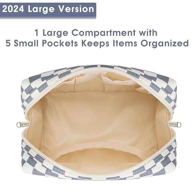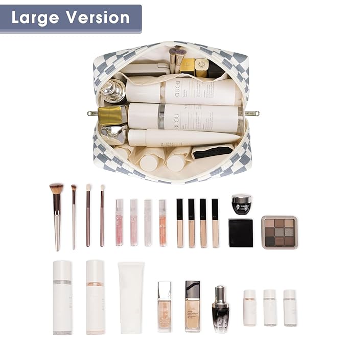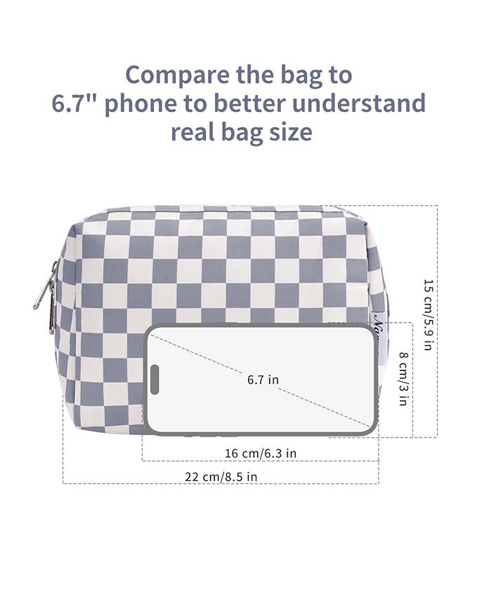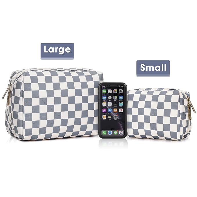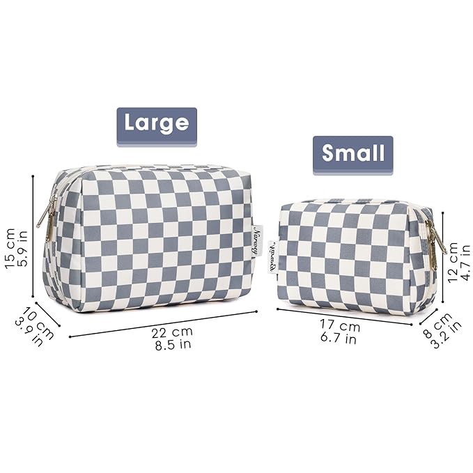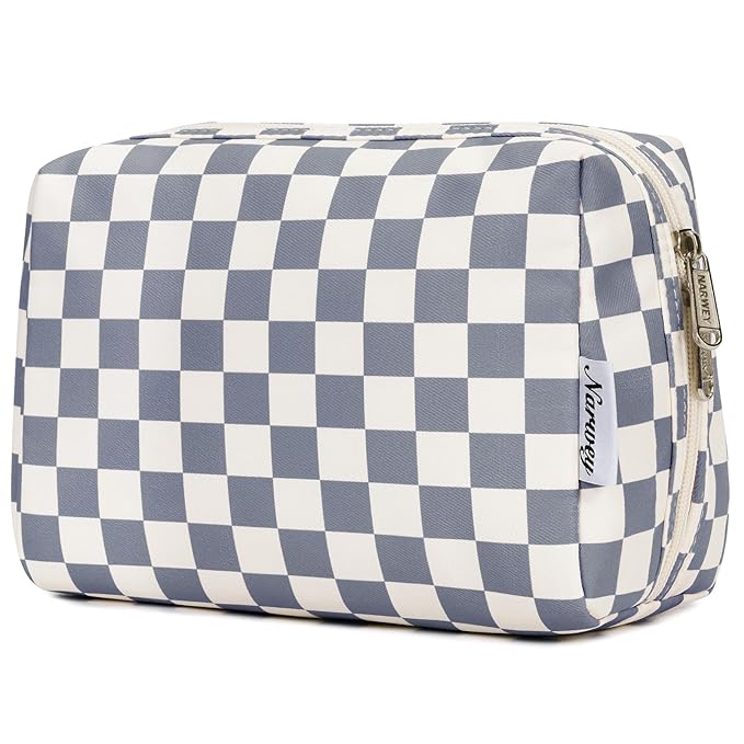 Narwey Checkered Makeup Bag Travel Cosmetic Bag Organizer Toiletry Bag Make Up Bags with Compartments for Women Girls (Large, Grayish Blue Checkerboard)