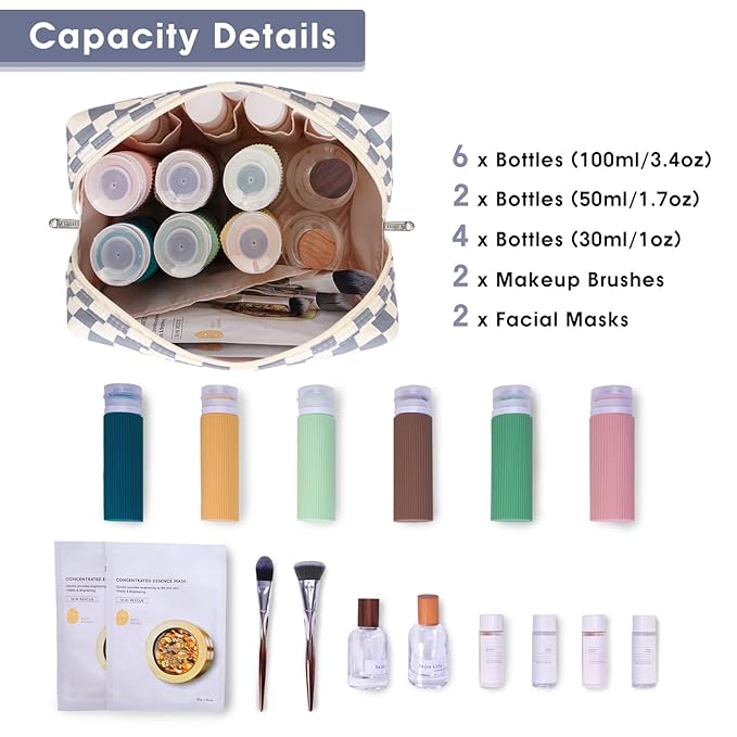 - WELL-ORGANIZED COMPARTMENTS. Practical main compartment with 5 inner small pockets could neatly organize your makeup. Main compartment could easily hold travel-size toiletries or skin-care products. It could fit 3 brushes, eyeliners, foundation, concealer, lipsticks, blushes, powder, eyeshadow pallet, mascara, lash curler, sponges, sunscreen, 3oz lotion, cream, facial cleanser and toothpaste