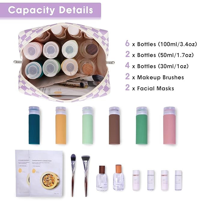 - WELL-ORGANIZED COMPARTMENTS. Practical main compartment with 5 inner small pockets could neatly organize your makeup. Main compartment could easily hold travel-size toiletries or skin-care products. It could fit 3 brushes, eyeliners, foundation, concealer, lipsticks, blushes, powder, eyeshadow pallet, mascara, lash curler, sponges, sunscreen, 3oz lotion, cream, facial cleanser and toothpaste