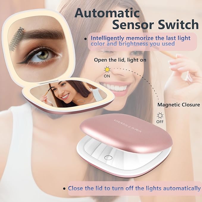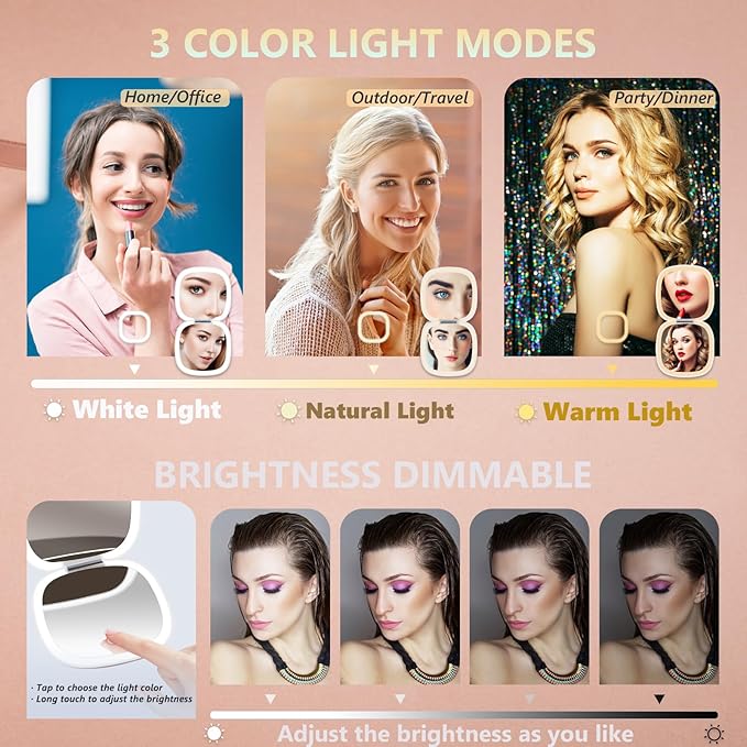 - 【3 Color Lights & Adjustable Brightness】 Our VAMILLKRA travel makeup mirror provide you 3 kinds of lights colors (white light/natural light/warm light) for different makeup applying. Short press the touch button to change Light Mode, while long pressed to dim or brighten the brightness of the light as you want. Our LED lights with both sides is pretty bright to light up your face.