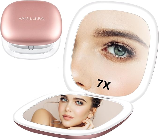 Travel Mirror with Light, 1X/7X Magnifying Mirror, 4 Inch LED Lighted Rechargeable Compact Makeup Mirror, 3 Colors Dimmable Light Up Portable Pocket Mirror for Handbag (Rose Gold 7X)