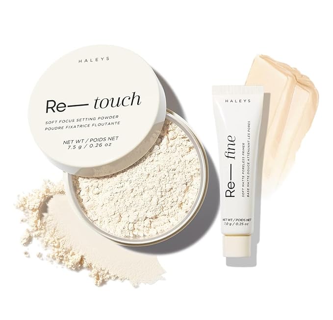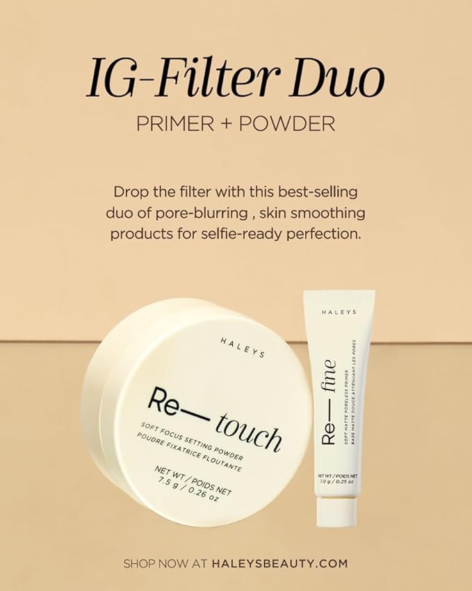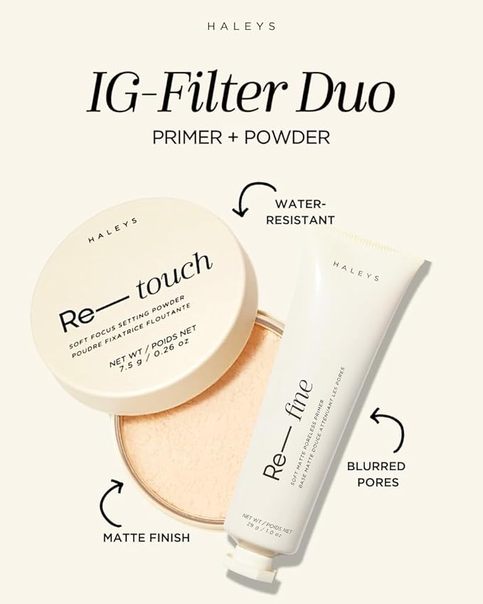 HALEYS IG Filter Duo (FAIR): Re-touch Setting Powder & Re-fine Soft Matte Poreless Primer, Skin Perfecting, Longwear, Smooths, Nourishes, Ultra-Blurring, No flashback, All Skin Types + Tones, Vegan