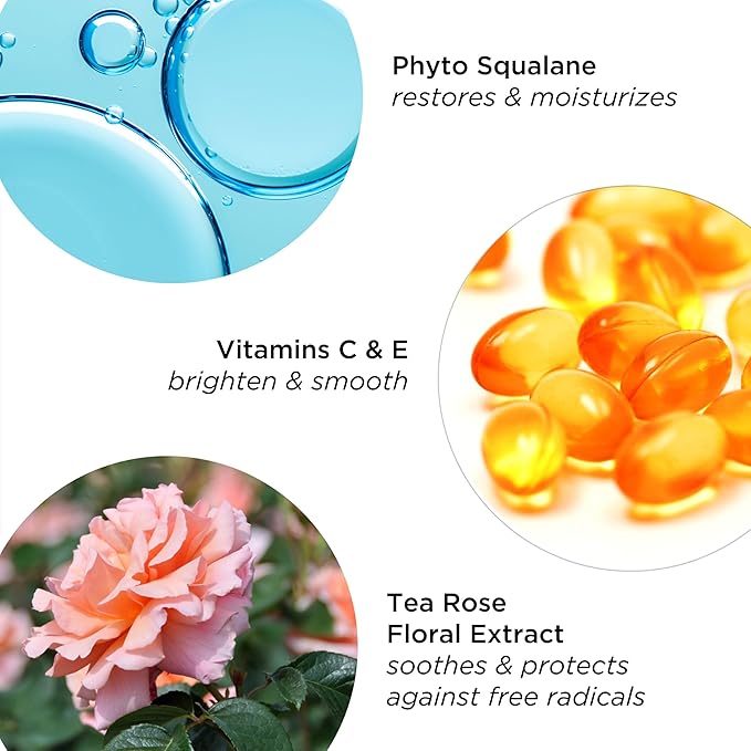 • INGREDIENT HIGHLIGHTS: Phyto Squalane to plump and moisturize, Vitamins C & E to visibly brighten and Tea Rose Floral Extract to protect skin.