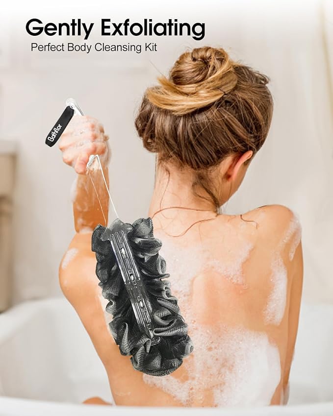 - What You Get: 17 inch loofah on a stick-back scrubber *1, and 80g ultra large shower loofah sponge-shower scrubber for body *4, and hook for shower loofa and bath brush *1, and large Gift Package *1, and first-class customer service. With unrivaled advantages and benefits, itβs an ideal gift for Valentine's Day, Mother's Day, Father's Day, Thanksgiving and Christmas Day, etc.