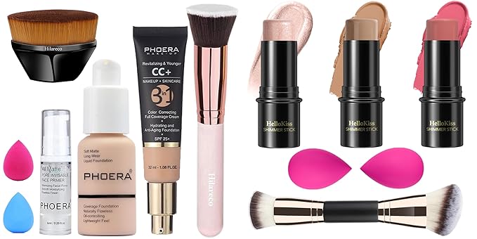 PHOERA Foundation,PHOERA CC+ Cream Color Correcting Anti Aging Hydrating Serum &SPF 25+,3 Pcs Cream Contour Stick Makeup Kit, Shades with Highlighter Stick, Blush Stick and Bronzer Contour Stick