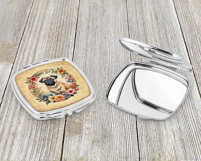 Caroline's Treasures Fawn Pug and Flowers Compact Mirror Decorative Travel Makeup Mirror for Women Girls Gifts Pocket Makeup Mirror Folding Handheld