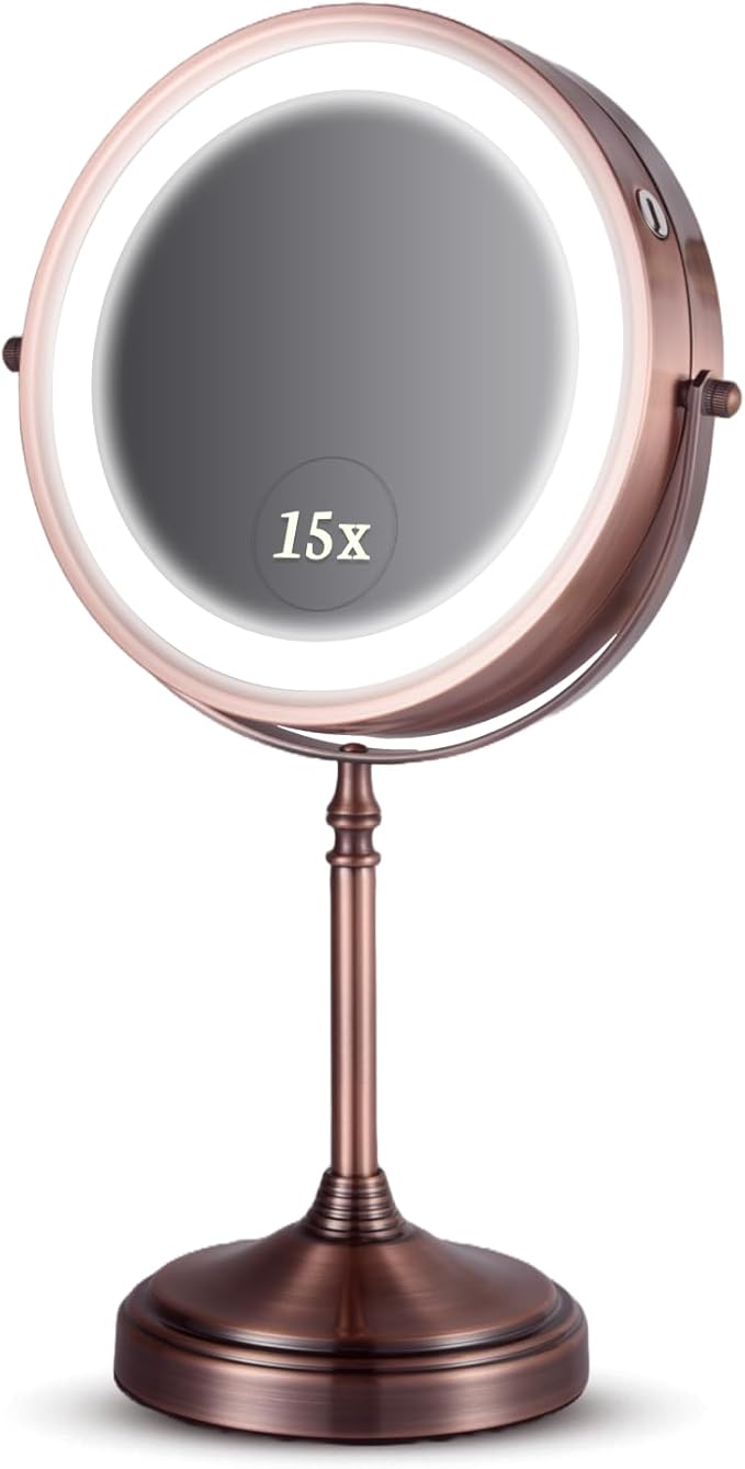 MIRRORVANA Lighted Make Up Mirror with 15X Magnification - 15X & 1X Double Sided LED Makeup Mirror with 3 Lighting Modes, Rechargeable Battery with USB Cable - 8" Wide & 15" Tall (Antique Bronze)