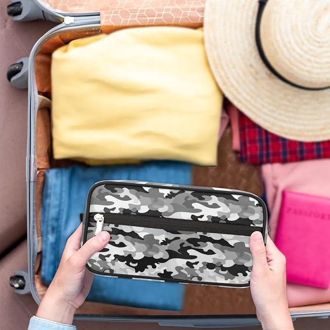 - 【Large Capacity】The black camouflage makeup bag has a large main zipper compartment for storing all other small items needed,such as cosmetics,razors,travel toiletries,etc;The outer layer has a zippered small pocket suitable for storing cash,cards,passports,phones,snacks,and other small items that can be conveniently carried around.