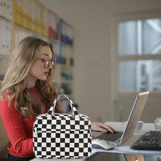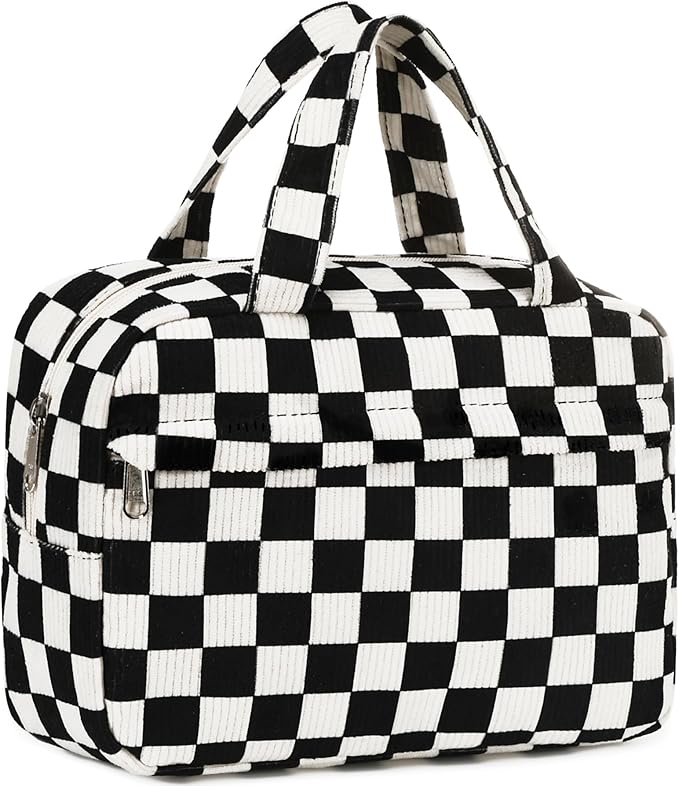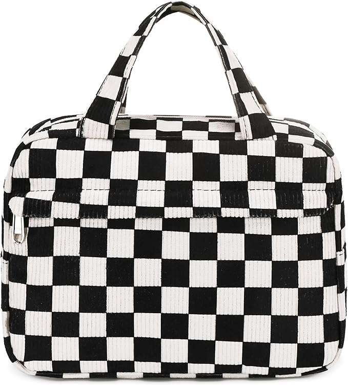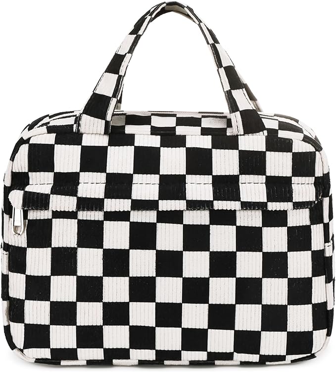 • 【Perfect size & Portable 】L*W*H:9.8*3.55*7 (inch) .Small size and large capacity design, make this brown white checkered cosmetic bag hold all your makeup items,like make-up base, powder, lipsticks, etc. And the makeup bags for women is easy and flexible to pack in your suitcase.