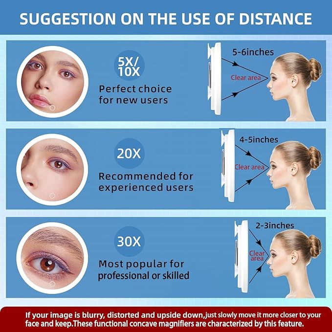 • 【30x Makeup Mirror for the Skilled Users】Tips 2:About Magnification:For the needs of different distances on the face, we design 5x10x20x30x magnification rates for you to choose. Newbie of the beginners we highly recommend you start with 5X/10X.*30X is suitable for professional or skilled users that adapt to strong magnification.
