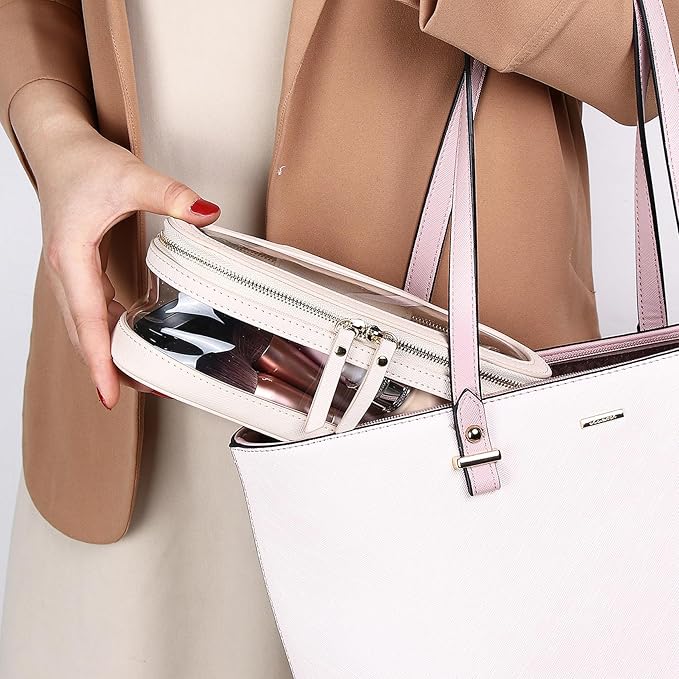 Makeup Brush Case Clear Travel Cosmetic & Toiletry Bag Slim Makeup Bag with Zipper Small Purse Organizer Car Essential Bag for Women (Beige, SLIM-2)